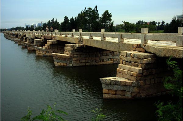 安平橋:屬于中國古代連梁式石板平橋,始建于南宋紹興八年(1138),歷時(shí)十四年告成。明清兩代曾多次重修。該橋是中古時(shí)代世界最長(zhǎng)的梁式石橋,也是我國現(xiàn)存最長(zhǎng)的海港大石橋。位于福建省晉江縣的安海鎮(zhèn),建于宋代,當(dāng)?shù)厝怂追Q“五里橋”。橋面由7條大石板鋪成,橋頭有五層六角磚砌成的寶塔一座,此橋?yàn)楣糯缍茸畲蟮牧菏绞瘶颍小疤煜聼o此長(zhǎng)橋”的美稱。