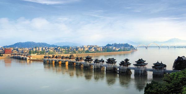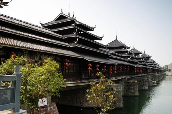 風(fēng)雨橋:坐落在廣西三江縣的程陽村邊的林溪河上,全橋?yàn)槭漳久嫱唔斀Y(jié)合而成。橋上建有五座寶塔形狀的樓亭,可避風(fēng)雨。整座橋無一鐵釘,全用桁槽銜接,它斜穿直套、縱橫交錯(cuò),十分精致牢固。坐落在廣西三江林溪河上的程陽橋是風(fēng)雨橋的代表。因橋上建有廊和亭,既可行人,又可避風(fēng)雨,故稱風(fēng)雨橋。這座橋建于1916年,是一座四孔五墩伸臂木梁橋。其結(jié)構(gòu)以橋墩、橋身為主的兩部分。墩底用生松木鋪墊,用油灰沾合料石砌成菱形墩座,上鋪放數(shù)層并排巨杉圓木,再鋪木板作橋面,橋面上蓋起瓦頂長(zhǎng)廊橋身。橋身為四柱抬樓式建筑,橋頂建造數(shù)個(gè)高出橋身的瓦頂數(shù)層飛檐翅起角樓亭、美麗、壯觀。五個(gè)石墩上各筑有寶塔形和宮殿形的橋亭,逶迤交錯(cuò),氣勢(shì)雄渾。長(zhǎng)廊和樓亭的瓦檐頭均有雕刻繪畫,人物、山水、花、獸類色澤鮮艷,栩栩如生,是侗鄉(xiāng)人民智慧的結(jié)晶