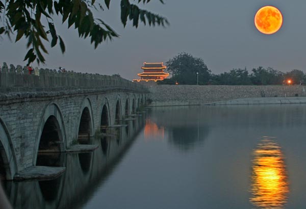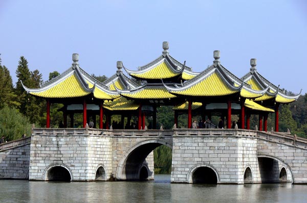 五亭橋:建于乾隆二十二年(1757年),是仿北京北海的五龍亭和十七孔橋而建的,位于江蘇揚(yáng)州瘦西湖內(nèi),橋基由12條大青石砌成,橋身為拱圈形。上建五亭、下列四翼,橋洞正側(cè)凡十有五,由3種不同的圈洞聯(lián)合,共有15孔,孔孔相通,橋上置有五亭,而且亭與亭之間又以廊相連。既有南方之秀,也有北方之雄。