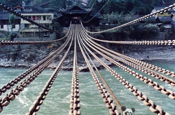 鐵索橋:中國現(xiàn)存的古老鐵索橋之一。又稱瀘定橋。位于四川省瀘定縣城西,跨越大渡河。清康熙四十四年(1705 )九月動(dòng)工,次年四月完工。橋凈跨 100 米,凈寬 2.8 米,橋面距枯水位 14.5 米。全橋共用鐵索鏈 13 根,,鐵鏈粗如碗口, 每根長(zhǎng)150米左右,重約一噸,其中 9 根用作承重底索,上覆橫縱木板作橋面,可通行人、畜; 4 根用作扶手,布置在橋面兩側(cè)。