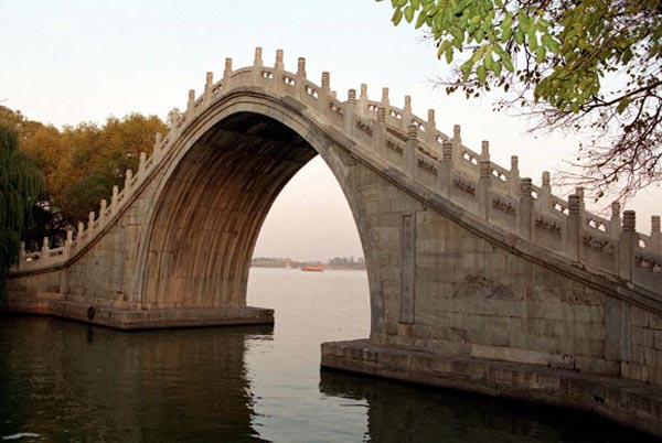 玉帶橋:玉帶橋位于北京頤和園昆明湖長(zhǎng)堤上,建于清乾隆年間(公元1736-1795年)。該橋單孔凈跨11.38米,矢高約7.5米,全部用玉石琢成,橋面是雙反向曲線,組成波形線橋型,配有精制白石欄板,顯得格外富麗堂皇。此橋位于北京頤和園內(nèi),全橋用漢白玉石建成,拱圈為蛋形,兩側(cè)雕刻精美的欄板和望柱,通體潔白、線條流暢。遠(yuǎn)望猶如一條玉帶點(diǎn)綴在碧波粼粼的昆明湖上,被游客贊為“海上仙島”